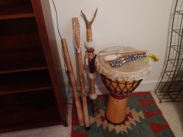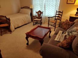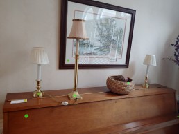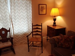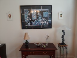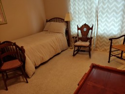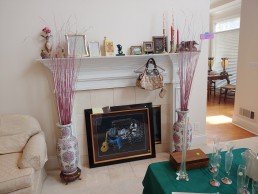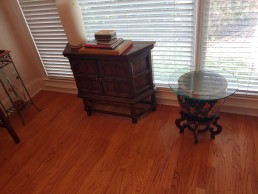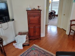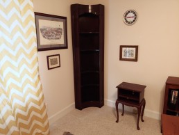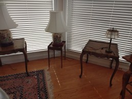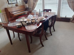 FINE FURNISHINGS TO INCLUDE: BEAUTIFULLY CARVED CIRCA 1930’S CHERRY CORNER CUPBOARD. PAIR OF HAND CARVED ROSEWOOD ORIENTAL PLANT STANDS. SET OF THREE NESTING TABLES. FOUR PIECE DINING SET W THREE LADDER BACK CHAIRS.