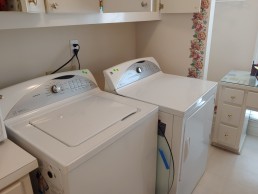CIRCA 1940S HAND CARVED WOODEN ROCKING HORSE, YAMAHA UPRIGHT PIANO, WASHER & DRYER